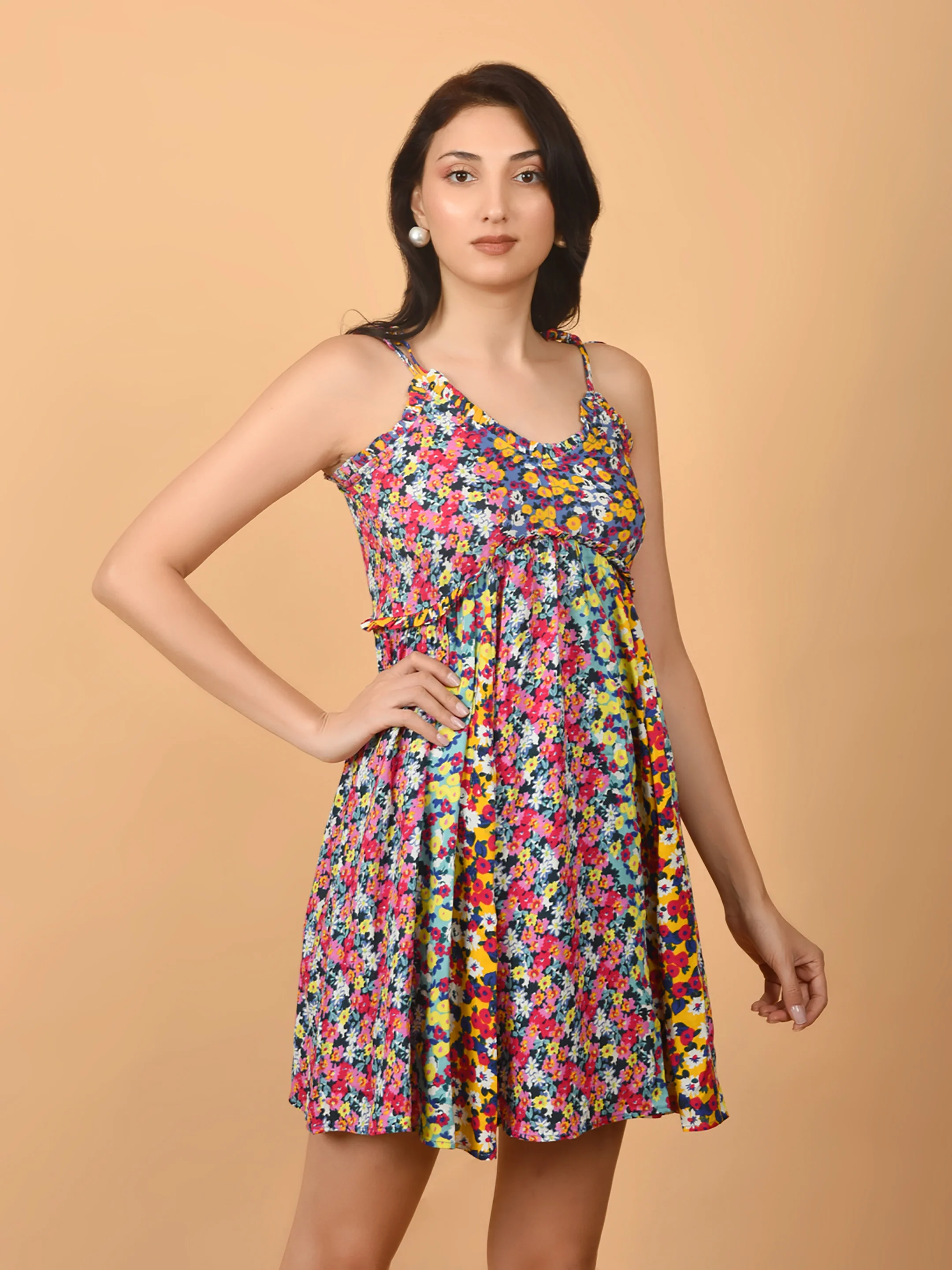 The Trendy Multicolor Floral Mini Dress is more than just a garment; it's a mood. It's about embracing life's colorful journey, expressing your unique spirit, and radiating sunshine from within.