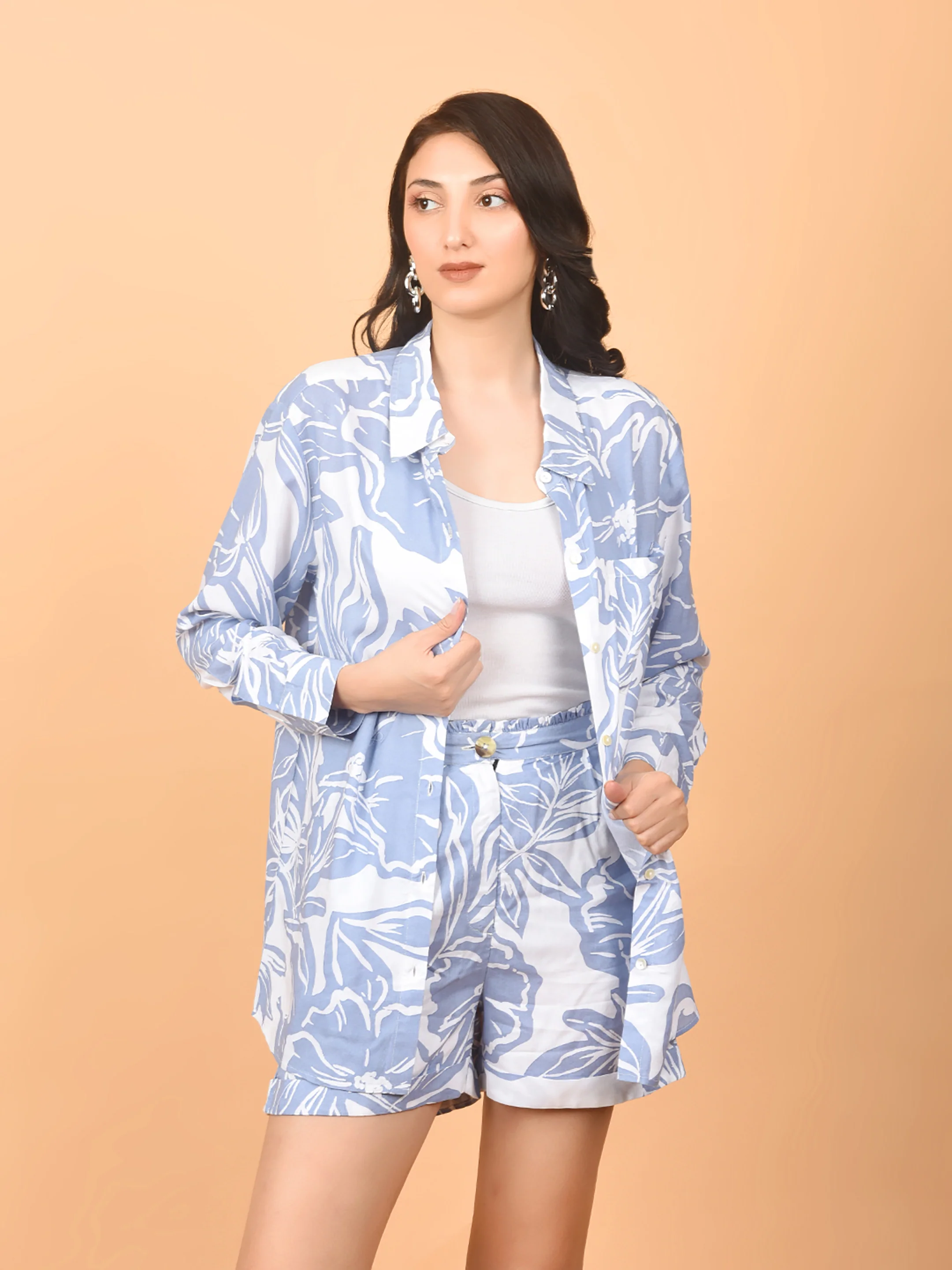 The lightweight material makes the co-ord set ideal for all seasons. You can pair it with your favorite sneakers or sandals for a casual look or dress it up with heels for a more formal event. With its versatility and style, our Women Blue Printed Co-ord Set is a must-have in your wardrobe.